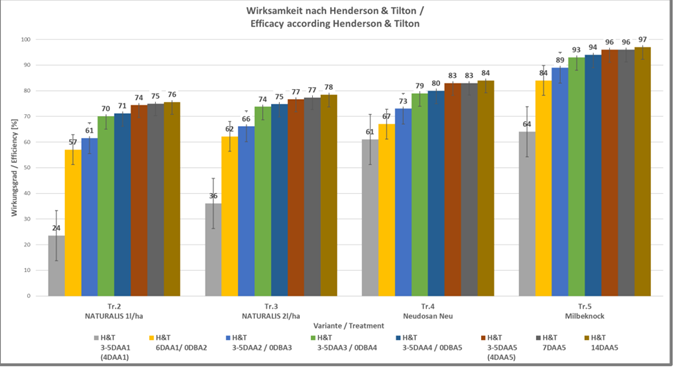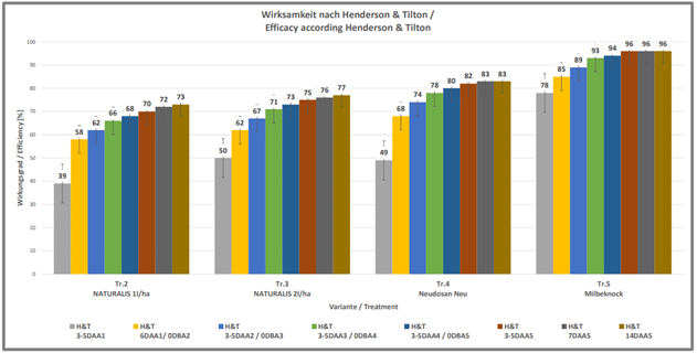 - Die biologischen Mittel Naturalis (hohe Aufwandmenge, Variante 3) und Neudosan Neu (Variante 4) zeigten ein ähnlich gutes Ergebnis gegen die Spinnmilben. Naturalis mit der niedrigen Aufwandmenge (Variante 2) war die schwächste Variante in Bezug auf die Bekämpfung sowohl der beweglichen Stadien als auch der Eier der Spinnmilben.